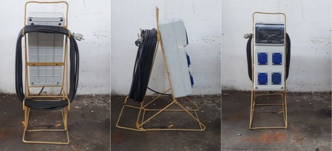 El tablero cuenta con: llave diferencial 80a, térmica trifasica 63a, llave térimica monofasica de 32a, llave térimica monofasica de 20a, toma tipo schuko con tapa embutir, ficha aerea macho 32a 3p n t 6h, toma industrial 2p t 16a, toma 32a 3p t 6h y cable 4x4 de 20 metros.