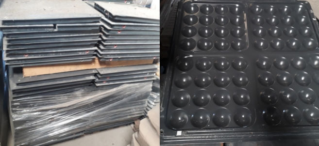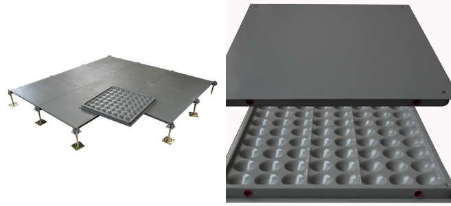 Placas de acero rellenas con concreto alveolar, estan pintadas con epoxi. permite ser revestido con moquette/moquette modular/pisos símil madera (pvc)/ granito. dimensiones: 60x60 cm2, espesor: 32mm. cantidad por m2: 3 placas.